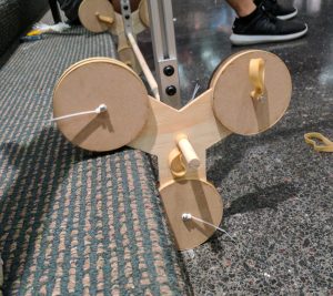 We looked at existing wheel designs and built a rough model of what it’d look like. We used 80/20 aluminum for the frame and laser cut wood pieces for the tri-wheel system. Access to supplies were limited, so we assembled jury-rigged the wheels with zip-ties, rubber bands and hot glue.